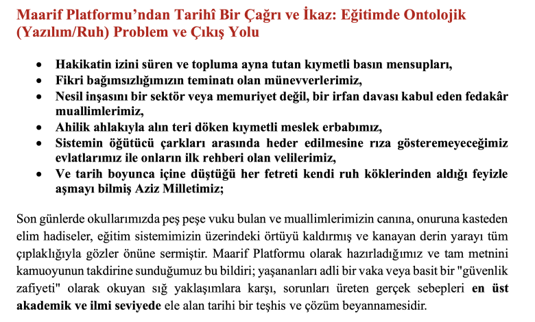 (Bildirinin Tam Metin, Bildiriye ulaşmak için linki tıklayınız) https://www.maarifplatformu.com/maarifin-istiklali-birlik-ve-dirilis-cagrisi/